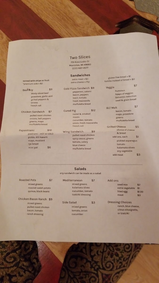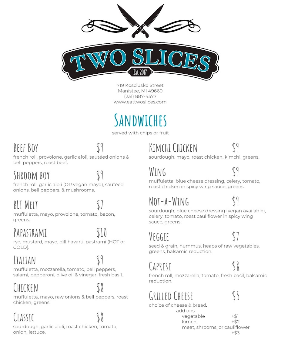 Welcome to Two Slices, a hidden gem nestled in the heart of Manistee, MI. This delightful eatery has quickly become a favorite for locals and visitors alike, thanks to its thoughtfully crafted menu that celebrates flavor and quality.